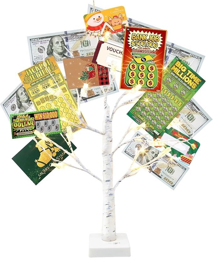 Light up the room and the excitement with this unique Vanthylit Lighted Money Tree Gift Holder, perfect for gifting with a creative twist! This eye-catching 2-foot birch-style tree is wrapped in elegant birch bark tape and features 24 warm white LED lights, adjustable branches, and clip holders — all ready to showcase a cascade of scratch-off lottery tickets. This tree is more than just décor — it’s an interactive, fun-filled gift that adds instant excitement to any celebration. Whether you're looking to surprise someone with a chance to win big or add a creative centerpiece to your event, this lighted tree is a guaranteed crowd-pleaser. 🎉 Bid now and light up someone’s day with a glowing tree full of lottery dreams!